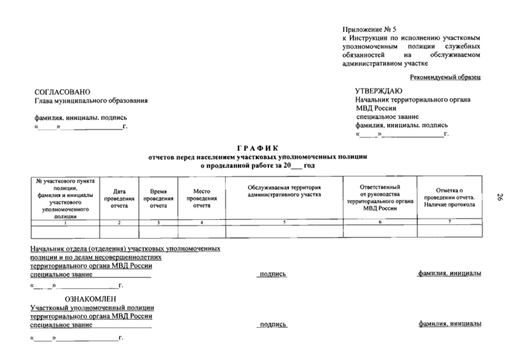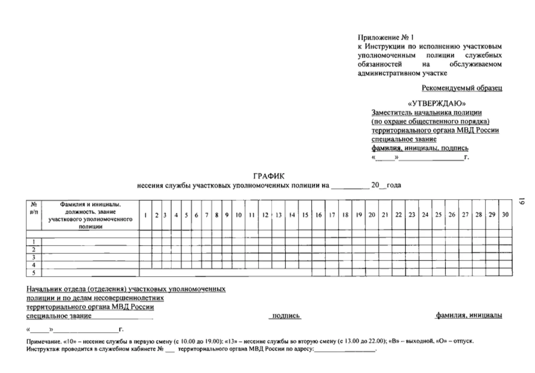 14. Участковый уполномоченный полиции осуществляет деятельность по утвержденному заместителем начальника полиции (по охране общественного порядка) территориального органа или начальником отдела полиции графику несения службы, в котором указываются служебные и выходные дни, дни отпуска сотрудников, а также время заступления участковых уполномоченных полиции на службу (приложение № 1 к настоящей Инструкции).