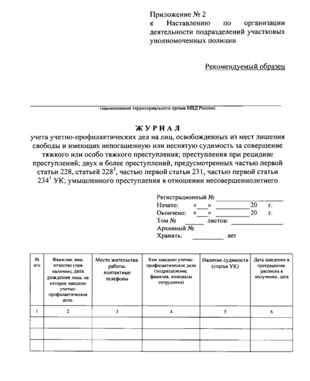 8.15. Ведет журнал учета учетно-профилактических дел на лиц, освобожденных из мест лишения свободы и имеющих непогашенную или неснятую судимость за совершение тяжкого или особо тяжкого преступления; преступления при рецидиве преступлений; двух и более преступлений, предусмотренных частью первой статьи 228, статьей 228.3, частью первой статьи 231, частью первой статьи 234.1 УК; умышленного преступления в отношении несовершеннолетнего территориального органа МВД России на районном уровне (приложение № 2 к настоящему Наставлению).
