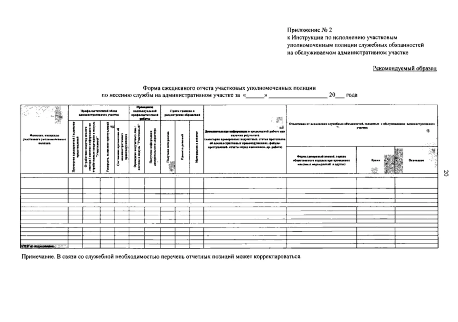 Приложение № 2 к Наставлению по организации деятельности подразделений участковых уполномоченных полиции