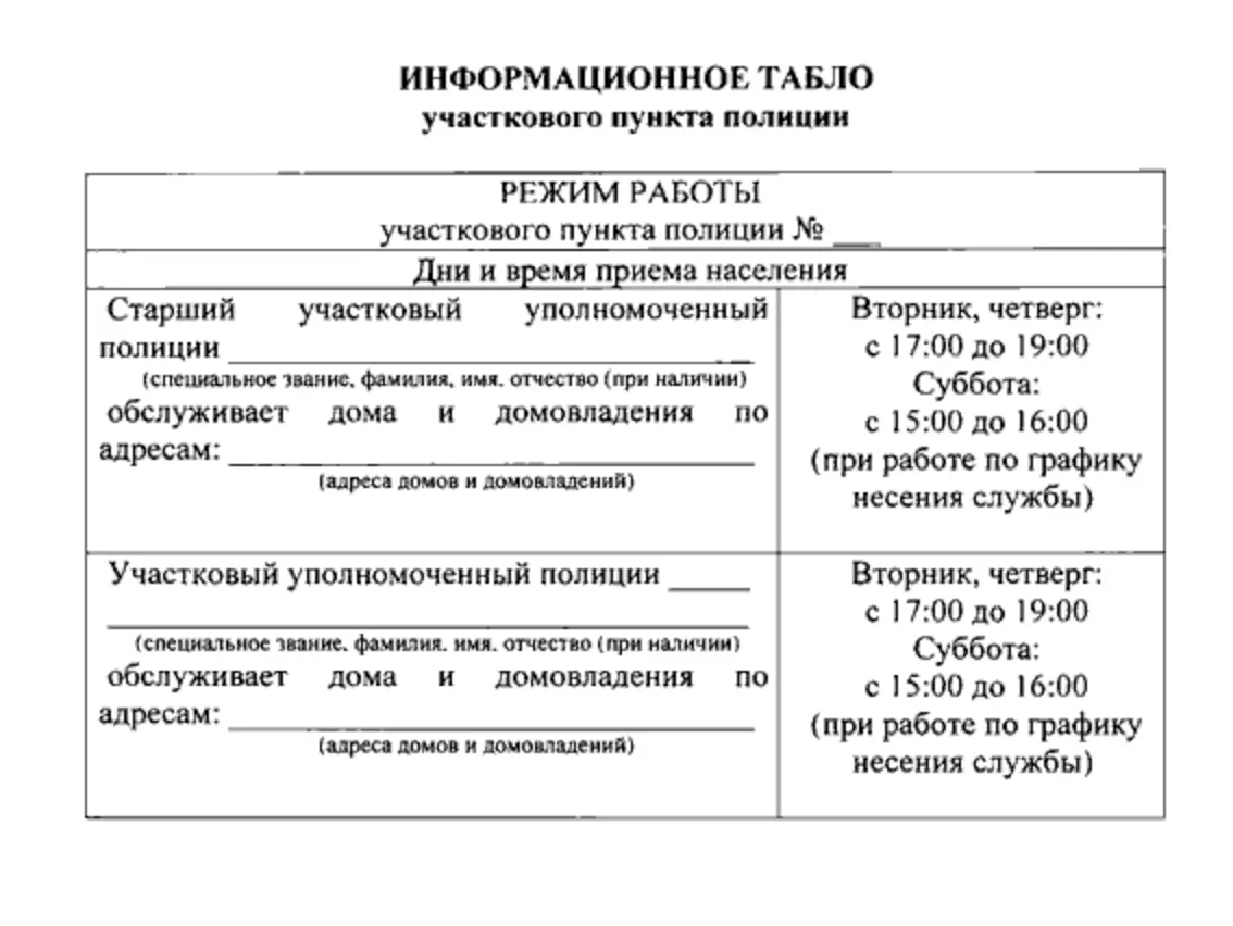 31. Прием граждан участковый уполномоченный полиции осуществляет на административном участке в помещении участкового пункта полиции по вторникам и четвергам с 17.00 до 19.00, а также по субботам с 15.00 до 16.00 при несении службы на обслуживаемом административном участке. В случаях отсутствия на административном участке участкового пункта полиции, невозможности осуществления приема граждан на участковом пункте полиции, по решению начальника территориального органа участковый уполномоченный полиции может проводить прием граждан в здании территориального органа или помещении, предоставленном органами местного самоуправления.
