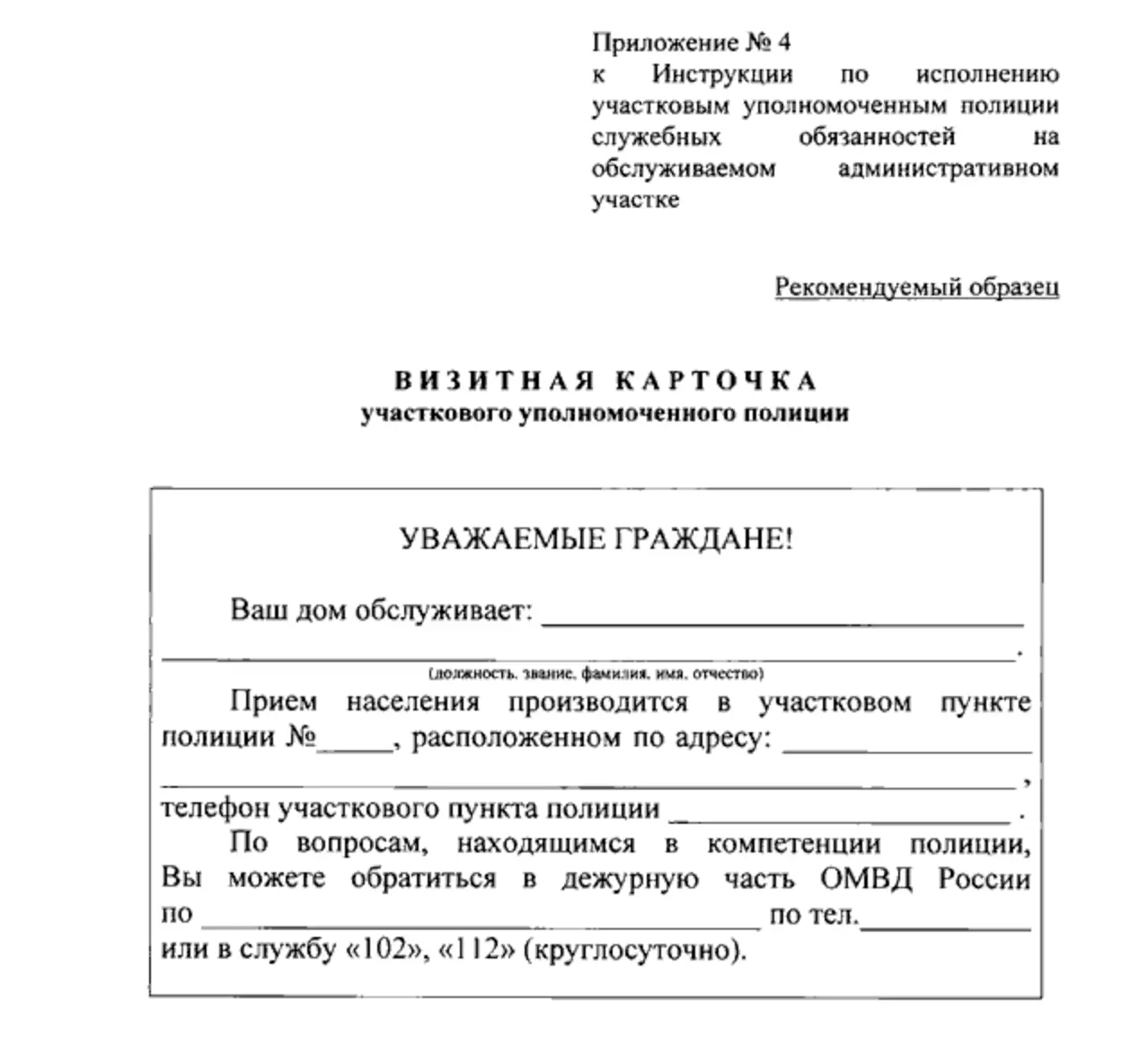 24.4. Вручает визитные карточки гражданам и представителям организаций, расположенных на территории административного участка (приложение № 4 к настоящей Инструкции).