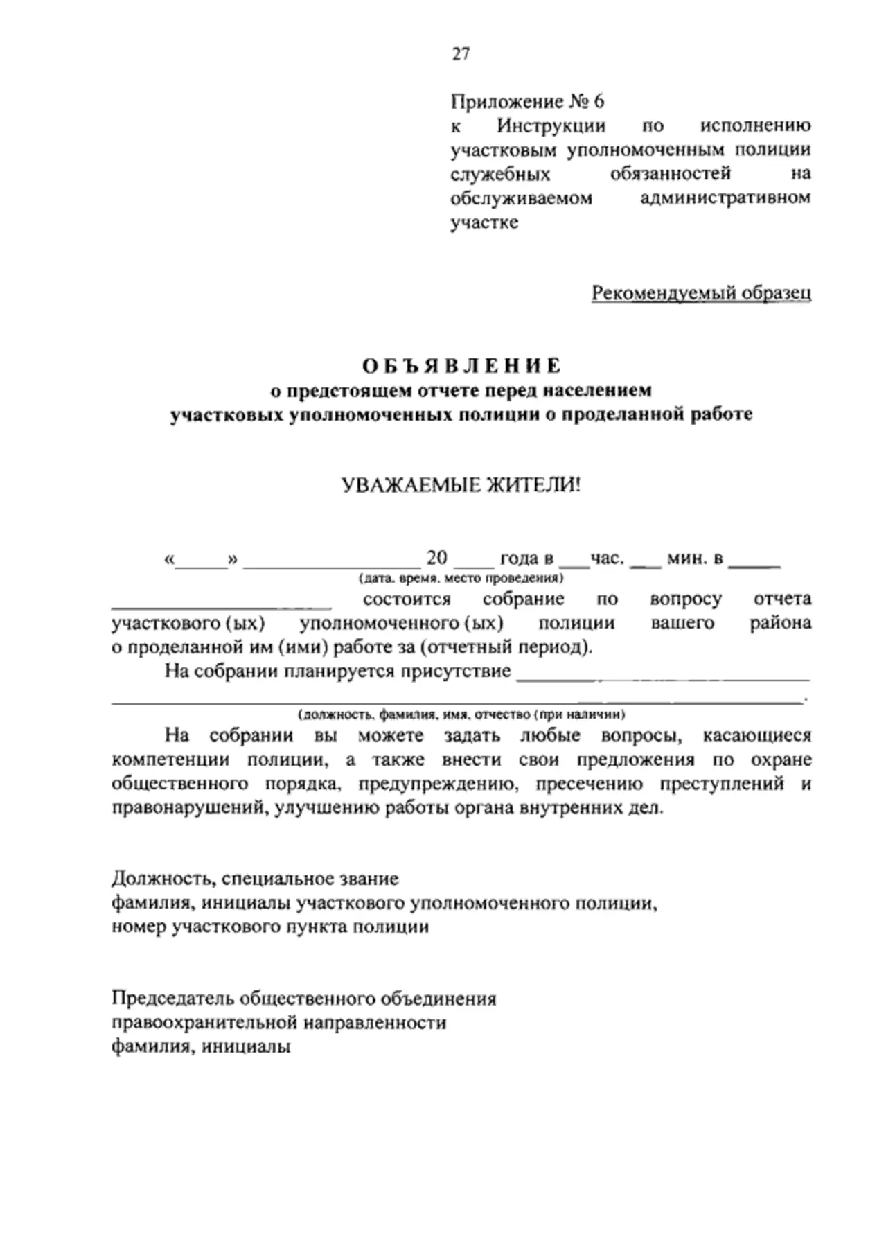 21. Свою деятельность при несении службы участковый уполномоченный полиции осуществляет на обслуживаемой территории либо в служебном помещении, расположенном на административном участке — участковом пункте полиции (приложение № 3 к настоящей Инструкции).